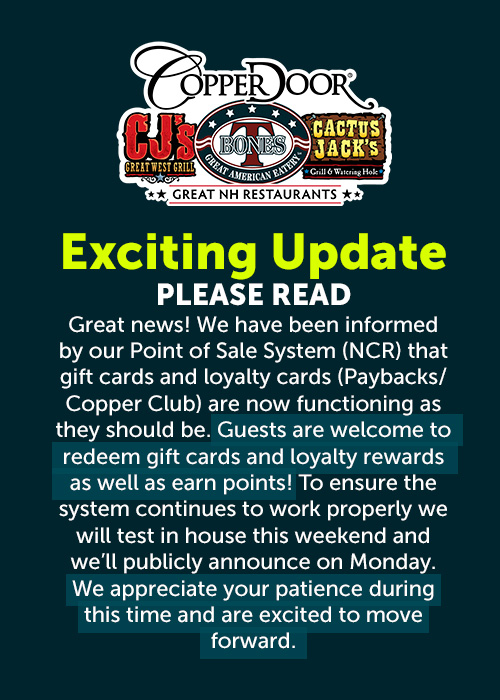 copper door is a new american and upscale comfort foods restaurant in salem, nh. copper door restaurant offers a wide range of dishes featuring local sources, new england seafood, stone oven creations, and premium. welcome to copper door® restaurant located in bedford and salem new hampshire. copper door offers a wide range of dishes featuring local sources, seafood, steaks, salads and more. explore the variety of snacks, soups, salads, butcher cuts, seafood, and copper classics at copper door restaurant in salem, nh. See menu, reviews, hours, contact. Not too fancy, not too. guests at the copper door ® enjoy a wide ranging, exciting and inventive combination of tastes featuring local sources, new. our menu offers a wide ranging, exciting and inventive combination of tastes featuring local sources, new england seafood, classic yet.